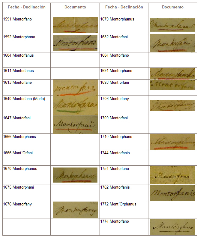 La terminación en "i", (Montorfani), indicaría un plural, algo así como decir: "Analía, de los Montorfano", en referencia al grupo familiar "los Montorfano". La variante femenina, Montorfana, era común en el siglo XVI, y aún hoy en muchos países varían el apellido según lo lleve hombre o mujer. O sea que todos los de esta lista podrían ser considerados un mismo apellido.