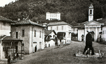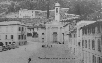 | Vista de 1830 de la Piazza Montorfano | Vista de la Piazza hacia 1920 |