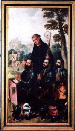 La imagen está datada en 1530, obra Jan Van Hemessen, se trata de: "San Benito con los Caballeros de Alfaro y Bravo de Lagunas", forma parte de un tríptico y el escudo que apenas se ve lleva las armas de los Alfaro y los Bravo de Lagunas, se encontraba en la iglesia de San Vicente, de Sevilla, capilla de los Alfaro. La capilla de los Alfaro no subsiste como tal, pero el cuadro puede verse aún allí. Fdo: Antonio Alfaro de Prado Sagrera Mayor información en http://alfaro.genealogica.net |