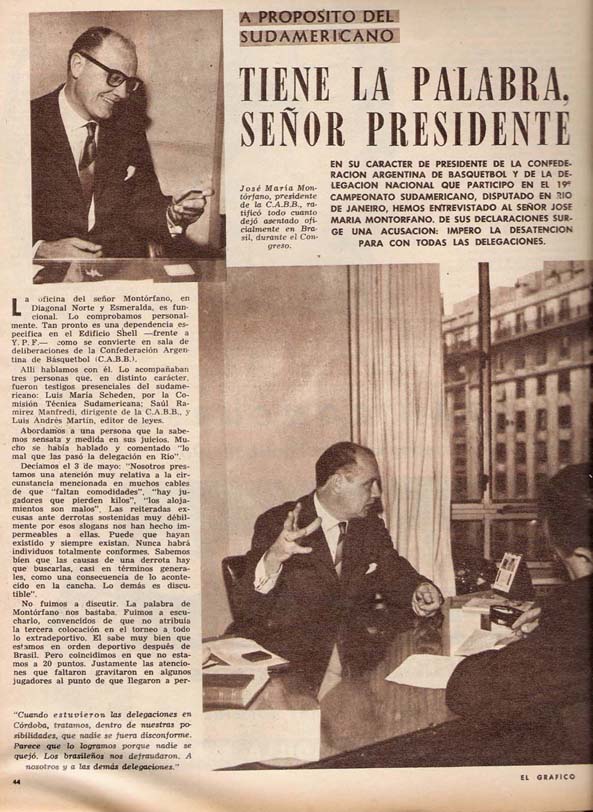 "Entre Ríos Basquet" N° 6, año 1, de febrero 2013La primera cita en Paraná"La aspiración más grande del básquetbol entrerriano está a días de concretarse. En este deporte se entiende que se ha llegado a disfrutar de ¡a máxima responsabilidad cuando se concede la organización de un Campeonato Argentino". definió José María Montórfano. presidente de la Federación de Básquet de Entre Ríos, días antes del inicio de la 13° edición de la competencia en la capital entrerriana. Dicho campeonato se desarrolló en el año 1941, Montórfano contaba con 28 años. Leer más abajo... |