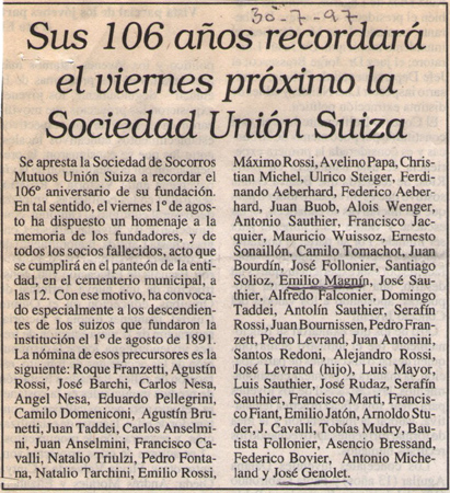 La mutualidad en Argentina surge como iniciativa de los inmigrantes, colonos en su mayoría, como medio para atender la situación económica y social de sectores de medianos y escasos recursos de la población, cuyo fin era fortalecer sus sentimientos patrióticos, conservar sus tradiciones y proteger su salud. La “Sociedad de Socorros Mutuos Unión Suiza” de Paraná fue fundada en 1861. Según cuenta Juan Carlos F. Wirth en el libro "Historia de una mutualidad entrerriana: Ochenta años de acción de la Sociedad de Socorros Mutuos "Unión Suiza" de Paraná, 1891-1973" (Librería y Editorial Colmegna, Santa Fe, Arg. 1974) los hechos de la fundación se desarrollaron como sigue: a) El domingo 26 de julio de 1891 se reúnen en el restaurante “Las Colonias” de Camilo Domicone (suizo italiano) en Paraná, treinta y tres suizos italianos, alemanes y franceses, para fundar en el día de la celebración del nacimiento de Confederación Helvética (1 de agosto de 1291) una sociedad de socorros mutuos. El martes 28 de julio de 1891 se reúnen en la casa de Roque Franzetti (suizo italiano) y resuelven celebrar la magna fecha con un lunch en la casa de Luis Sessarego, frente al palacio de gobierno, invitando a otros suizos. La tarjeta costaba 5 pesos. Se presupuestó 175 pesos para vino, masas, sandwiches, músicos, cigarros y otros gastos, se proponen treinta personas más para conformar la sociedad, de los cuales concurren veintitrés. En este grupo está Emilio Eduardo Magnin (mi tatarabuelo).