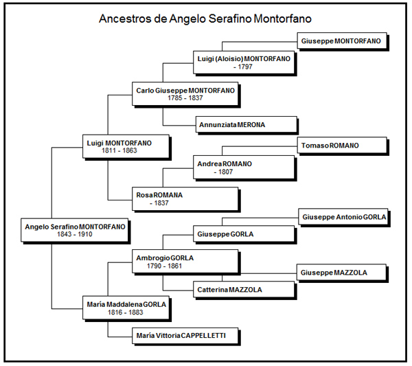Este cuadro muestra la ascendencia de mi bisabuelo Angelo Serafino Montorfano, hasta donde pude investigar a la fecha. Debajo encontrarán más ampliada la información sobre mis ramas Montorfano y Gorla, desde mi ancestro más antiguo, hasta mi.