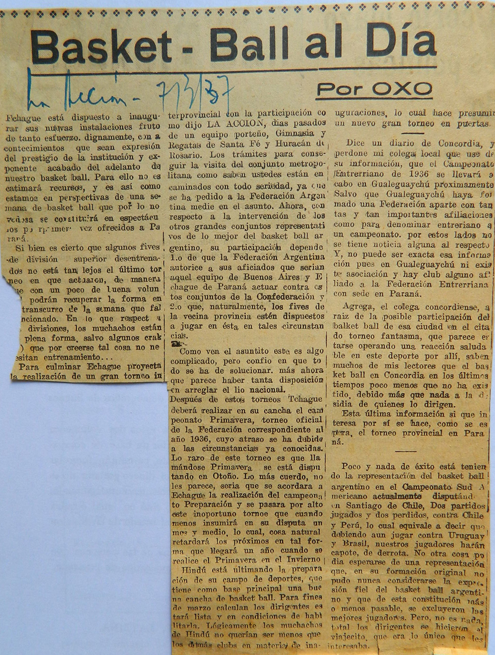 Bajo el seudónimo de OXO, publicó comentarios sobre básquetbol en el diario "La Acción" [Ver artículo del 7/3/1937] y hasta 1942 también colaboró con "Orientación", ambos de Paraná, Entre Ríos. Fue fundador, conjuntamente con otros pioneros del básquetbol paranaense, del Quique Club llamado así en homenaje a una gran figura del deporte argentino, Enrique Thompson, entidad que presidió en el período 1942-43. Presidió la Federación Entrerriana de Básquetbol y luego de ser trasladado a Santa Fe lo fue de la Asociación Santafesina, lo mismo sucedió durante su permanencia en la ciudad de Tucumán.