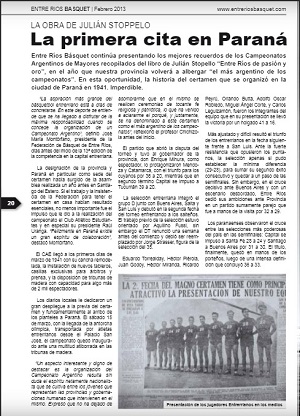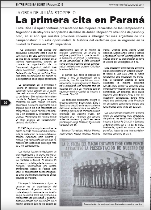 "Entre Ríos Basquet" N° 6, año 1, de febrero 2013La primera cita en Paraná"La aspiración más grande del básquetbol entrerriano está a días de concretarse. En este deporte se entiende que se ha llegado a disfrutar de ¡a máxima responsabilidad cuando se concede la organización de un Campeonato Argentino". definió José María Montórfano. presidente de la Federación de Básquet de Entre Ríos, días antes del inicio de la 13° edición de la competencia en la capital entrerriana. Dicho campeonato se desarrolló en el año 1941, Montórfano contaba con 28 años. Leer más abajo... |