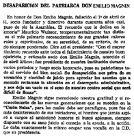 a) El domingo 26 de julio de 1891 se reúnen en el restaurant “Las Colonias” de Camilo Domicone (suizo italiano) en Paraná, treinta y tres suizos italianos, alemanes y franceses, para fundar en el día de la celebración del nacimiento de Confederación Helvética (1 de agosto de 1291) una sociedad de socorro mutuos. El martes 28 de julio de 1891 se reúnen en la casa de Roque Franzetti (suizo italiano) y resuelven celebrar la magna fecha con un lunch en la casa de Luis Sessarego, frente al palacio de gobierno, invitando a otros suizos. La tarjeta costaba 5 pesos. Se presupuestó 175 pesos para vino, masas, sandwiches, músicos, cigarros y otros gastos, se proponen treinta personas más para conformar la sociedad, de los cuales concurren veintitrés. En este grupo está Emilio Magnin.