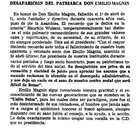 En su libro libro "Historia de una mutualidad entrerriana: Ochenta años de acción de la Sociedad de Socorros Mutuos "Unión Suiza" de Paraná, 1891-1973" el autor Juan Carlos F. Wirth escribe una interesante necrológica de Emilio E. Magnin que pueden leer Aquí.